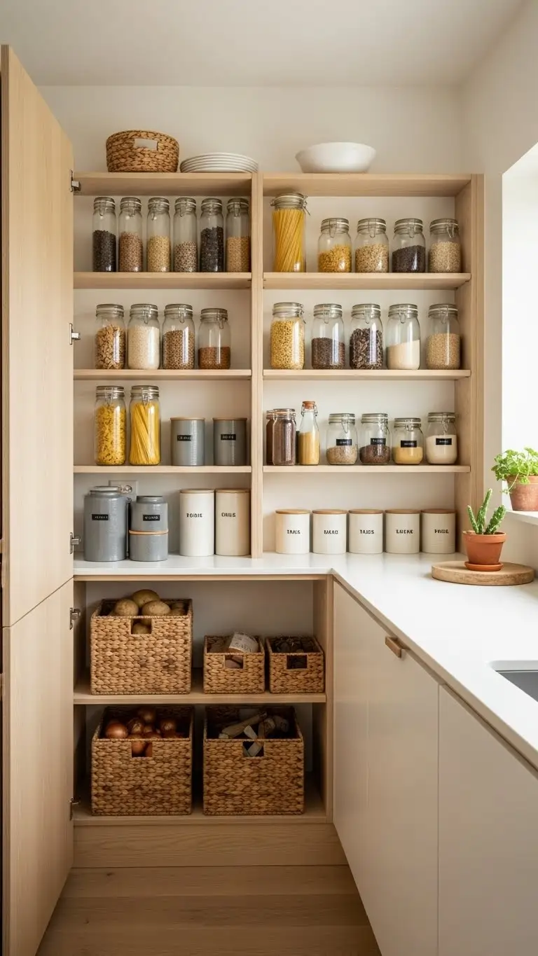 Baskets, jars, and labeled containers maintain order while complementing neutral tones.